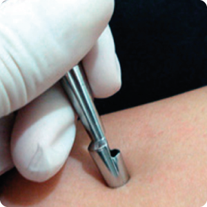 Generalmente se realiza con un sacabocado, el cual consiste en un cilindro con bordes afilados, que se aplica a presión y permite extraer un espécimen para enviarlo con un patólogo especialista en enfermedades de la piel para llegar a un diagnóstico preciso.